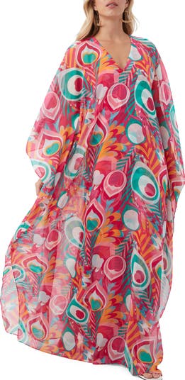 Printed maxi caftan dress with a chiffon overlay and printed lining