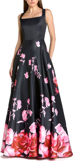 Satin A-line gown with a square neckline, wide straps, and a placement floral print at the hem for an elegant, statement finish.