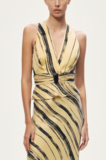 A refined sleeveless blouse with a fluid drape and waist-defining belt detail, perfect for pairing with tailored skirts or relaxed trousers for a polished day-to-evening look.