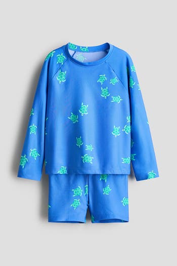 Printed swim set with a top in UV-protective fabric with UPF 50 and matching swimming trunks. Top with a small stand collar and long raglan sleeves to minimise the risk of friction from the seams. Trunks with an elasticated waist and a lined front.
