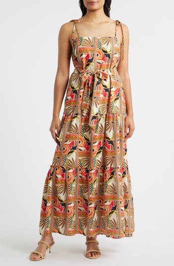 Delicate tie straps top this flowy sundress featuring a bold print and a removable tie belt on soft, linen-inspired fabric.