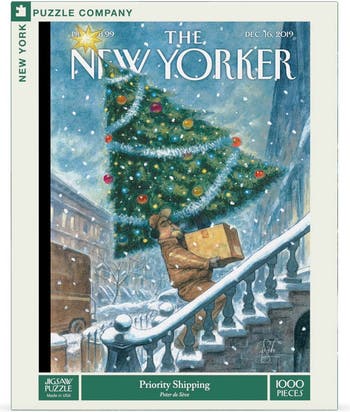 Celebrate the magic of Christmas in New York with this best-selling 1000-piece puzzle that captures the heartwarming hustle of the holiday season. This scene, originally a New Yorker cover by artist Peter de Sève, shows a dedicated delivery man braving the snowy night as he carries a beautifully decorated Christmas tree up a set of front porch stairs. With the tree’s star shining like a holiday miracle, this puzzle is a perfect gift for those who love New York, winter scenes, or the festive spirit of Christmas.
