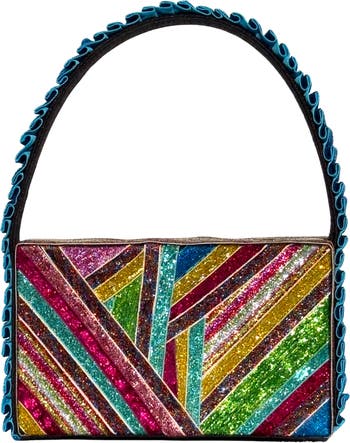 A vibrant box clutch woven with glitter fabric stripes and dazzling texture. Bold, playful, and unmistakably chic, it’s a statement piece designed to catch the light—and every eye.