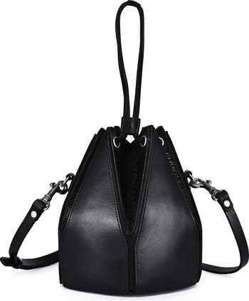 This convertible leather bucket crossbody brings a modern shape to everyday styling. The small silhouette offers an easy balance of relaxed structure and versatile wear.