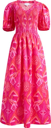 A smocked bodice defines the fit of this ikat-print maxi dress framed by puff sleeves and finished with a full skirt that moves with ease.