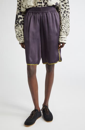 Channel retro energy with a subversive twist—these knee-length satin shorts pop with vivid contrast trim, all filtered through the Belgian designer’s unmistakable play on sporty style.