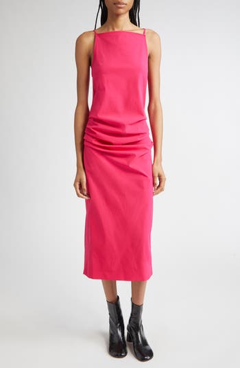 This vibrantly hued midi dress seamlessly blends edgy and elegant elements with a slim fit eased with ruching at the waist and an invisible zipper that lets you adjust the length of the back slit.