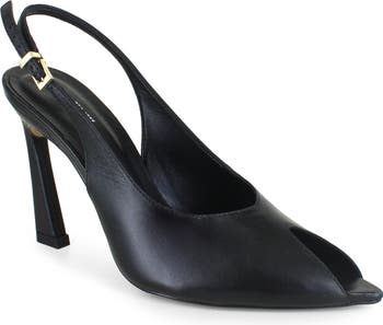 A pointy peep toe and lofty heel define this slingback pump balanced by a tapered heel for contemporary sophistication.