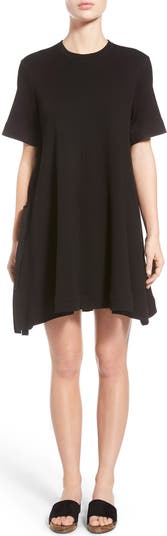 A trio of knotted ties at one side gently draws in a short-sleeve jersey dress cut in a in a loose, easy silhouette that gently flares and flows over the figure. Raw-cut edges around the crew neckline create a casually deconstructed feel.