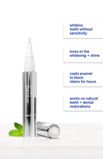 Meet your new favorite tooth-stain fighter. This on-the-go whitening innovation helps stop teeth stains before they start. Apply the whitening BOLT and enjoy coffee, tea, wine, fruit juices or berries and lock out stains for up to 6 hours. It’s the best way to maintain your white smile while still enjoying all your favorite things. The Calprox®-infused formula also whitens and helps improve shine.
