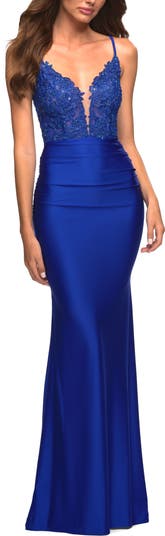 Beautiful gown with lace top embellished with rhinestones. Sheer waist with V neckline and lace up back. Jersey skirt features ruching. Back zipper closure.