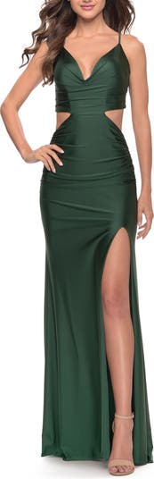 Jersey prom dress with trending side Cutouts and V cowl neckline. Open back with adjustable ties. Back zipper closure.