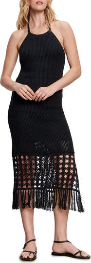 Extend sweater-dress-season in an all-cotton option knit to show off your shoulders and finished with flickering fringe.
