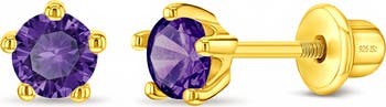 These adorable little girl earrings feature sparkling prong set cubic zirconia stones that add the perfect touch of shimmer to any outfit. Crafted from high quality 14k gold over sterling silver, they offer both durability and a beautiful finish. Designed with safety screw back closures, these earrings provide a secure and comfortable fit for everyday wear, giving parents peace of mind and little ones a delightful accessory they’ll love. A gift box is included with purchase.
