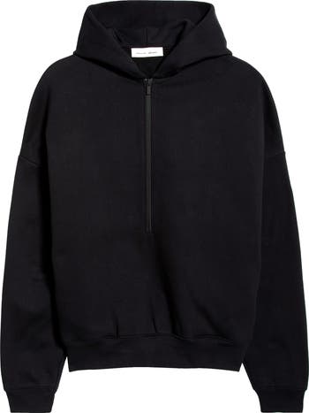 Satin appliqués brand the back of this half-zip hoodie cut from double-layer heavyweight fleece in a roomy silhouette.