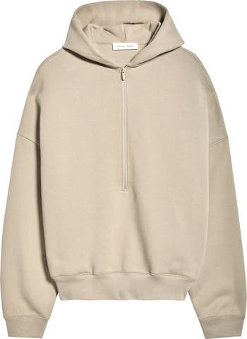 Satin appliqués brand the back of this half-zip hoodie cut from double-layer heavyweight fleece in a roomy silhouette.