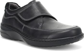 A wide hook-and-loop strap secures your foot, while a removable insole provides extra comfort on this casual leather slip-on shoe.