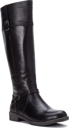This sleek leather boot with decorative buckle detailing is fitted with a cushioned, arch-supporting insole and a durable rubber sole.