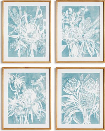 Monochromatic in a soft indigo hue, this set of protea illustrations in a modern, abstract style make a stunning set. Finished off with a real mat and natural wood frame, they are perfect for powder room, kitchen or study.