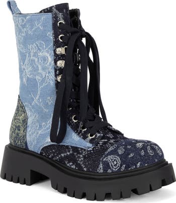 Colorblocked jacquard denim panels an eye catching combat boot.