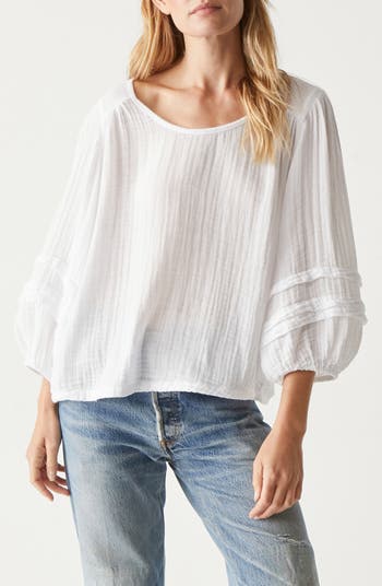 This gauzy cotton top is crafted with a scoop neckline and billowy sleeves.