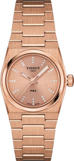 A perennially popular design from the Swiss brand, the PRX always presents a cleanly elegant look that pairs perfectly with its precision movement. This version maintains the minimalism while enhancing the enviable aesthetic with trios of white diamonds as the 12 hour markers on the champagne-colored dial. The brushed-steel bracelet texturally contrasts the polished bezel framing this sporty-chic timepiece.