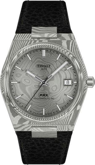 Inspired by the 1978 design, this version of the PRX watch features a striking moiré-effect Damascus steel case and dial and an embossed leather strap.