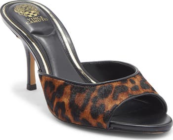 Genuine calf hair and leopard spots bring a wild kick to this slim-heel sandal outfitted with a padded footbed.