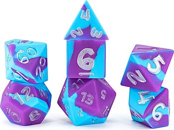 GATE KEEPER GAMES & DICE: ANTI-STRESS DICE - PSIONIC COMBAT - Anti-Stress Dice are super fun, super bouncy, dice made out of food grade silicone with pre-inked numerals in a matching metallic ink color. Each set is made out the softest food grade silicone you can hope for! Psionic Combat is designed to embody the energies of two powerful mentalists dueling within one another's minds! So intense and powerful is the battle that the Violet and Cyan colors are so mingled together you can no longer separate them. Anti-Stress Dice ARE GREAT FOR: • Quiet Rolling (Because you are a rogue ...or the kids are sleeping.) • Honest Rolling. (Because with a bounce like this, you can't fudge your rolls.) • A Stress Free Life! (Squeeze a fistful of them for maximum stress relief! : ) OVERVIEW: Each die has extra large easy-to-read numerals with ink that won't rub off for high-speed long-lasting gaming. Made of super soft food grade silicone, with custom manufacturing methods that prevent tearing or breaking, Gate Keeper Games & Dice's Anti-Stress dice can be bounced and goofed around with without fear of damage to your dice or the many surfaces (and people) they'll bounce off of!