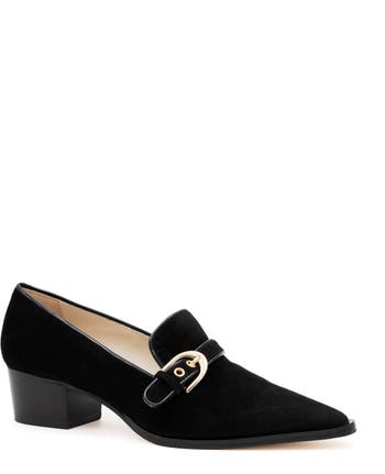 A buckled strap and pointy toe add luxe elements to an Italian-made leather pump featuring a loafer-inspired topline and low, stacked heel. A foam-cushioned footbed with built-in arch support delivers optimal comfort.