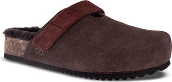 A signature ergonomic midsole brings a trifecta of comfort to this flexible suede clog warmed with cozy genuine-shearling lining. A corduroy strap offers an adjustable fit.
