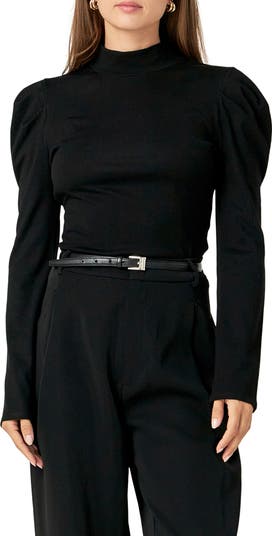 Decadent puffed shoulders give volume and charm to this close-fitting ribbed top.