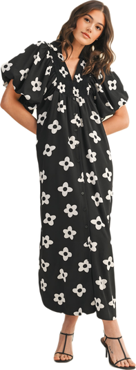 The Knit & Lounge puff sleeve maxi dress combines dramatic style with a breezy, relaxed silhouette. Featuring bold white floral prints on a rich black backdrop, this statement piece is designed with voluminous sleeves and a button-down front for effortless elegance.