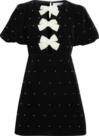 You'll be the life of the party in this vintage-chic minidress embellished with pearly beads and a trio of whimsical bows.