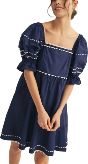 The Knit & Lounge Navy Puff-Sleeve Mini Dress is a playful yet polished piece with its square neckline, voluminous puff sleeves, and crisp white scalloped trim. Designed with a breezy A-line silhouette, this dress pairs modern femininity with timeless charm, making it perfect for weekend outings or casual gatherings.