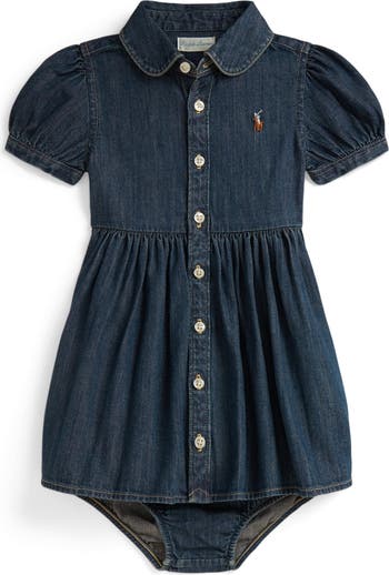 Indigo-dyed cotton denim brings structure to this puff-sleeve shirtdress paired with matching bloomers that complete baby's look.