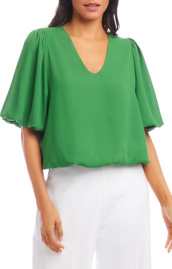 Dramatically puffed elbow-length sleeves frame this silky crepe top finished with an elastic hem that creates chic volume.