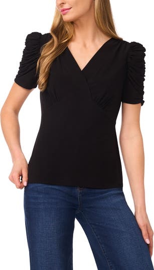 Shirred sleeves and a pretty puff sweeten a staple top done in a softly knit crepe.