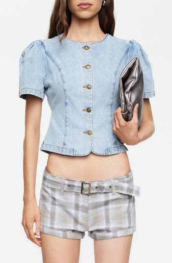 Traditionally rugged denim gets a glam upgrade with this paneled shirt upgraded with medallion-style buttons and sweetly puffed sleeves.