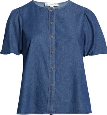 Charming puff sleeves sweeten the silhouette of this boxy denim top made in a classic indigo wash.