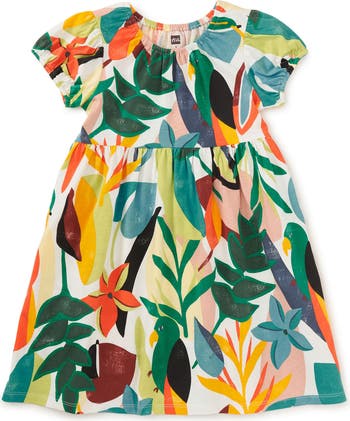 Introducing a new style from our Brazil collection! This dress effortlessly blends the charm of two beloved Tea styles: playful puff sleeves and a flattering empire silhouette. The classic empire waist and gathered skirt evoke timeless heirloom elegance, while the tropical-inspired print adds a modern, stylish twist. Crafted from ultra-soft 100% cotton jersey with elastic at the neckline and sleeve openings, this beauty is as comfortable as it is chic. Perfect for Easter celebrations, spring outings, or elevating everyday wear with a touch of tropical flair. Below mid-thigh length for a flattering fit.