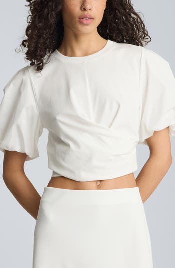 Grandly puffed sleeves sweeten the style story of this T-shirt with a faux wrap that nips in the cropped silhouette.