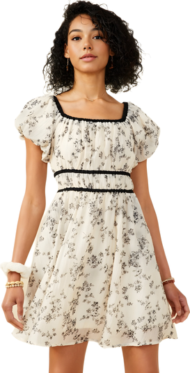 The Knit & Lounge puff sleeve mini dress brings a touch of romantic charm with its delicate floral print and soft cream hue. Featuring a square neckline with black trim and a gently flared skirt, this dress creates a feminine silhouette perfect for brunches, casual outings, or date nights.