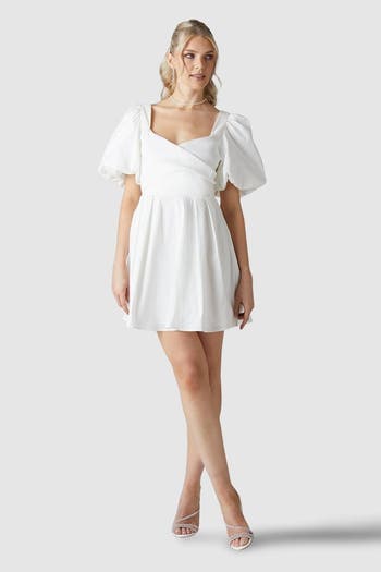 Make a captivating entrance on your wedding day with this charming mini dress from Coast. The structured taffeta creates a flattering shape whilst maintaining a light, airy feel that's ideal for both ceremony and celebration. The statement puff sleeves balance perfectly with the mini length, creating a modern yet timeless bridal look.