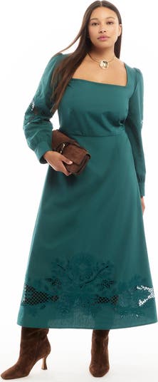 A subtly scalloped square neckline and intricate cutwork frame this long-sleeve poplin midi dress. It's finished with gently puffed sleeves and an elastic waist, making it an easy-wearing choice for the office, dinner reservations, & beyond. Women's plus-size midi dress. STYLE NOTES sleeves Square neckline Scalloped trim Elastic waist 54" length FABRIC & CARE 100% Cotton Machine wash gentle