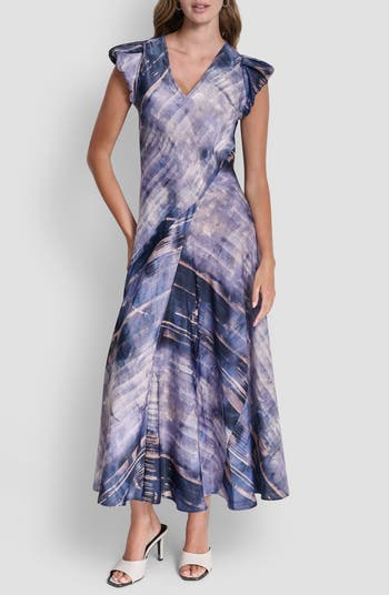 Serve contemporary flair anywhere you go wearing this puff-sleeve maxi dress made of bias-cut satin and designed with diagonal seaming that furthers the asymmetric look.