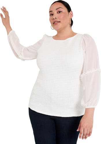 Boat neckline. Fitted smocked bodice. Long sleeves with ruffle detail. Gathering at sleeve cap and hem.