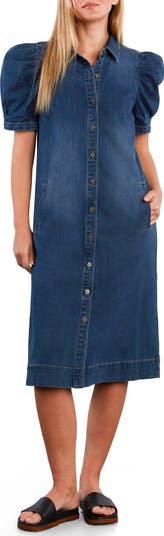 Darling puff sleeves enhance the charm of this denim midi that's kissed with stretch for a comfortable fit.