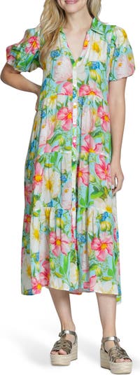 A lively floral print punches up your day in a lightweight shirtdress that's detailed with puff sleeves and a tiered midi skirt.