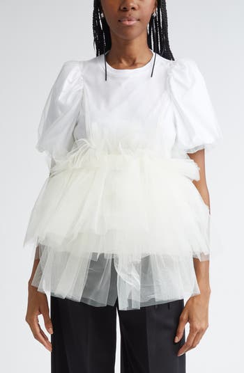 Simone's unmistakable sense of whimsy shines through the dreamy tulle-overlaid puff sleeves of this mixed-media top perfected with a decadently tiered tutu hem.